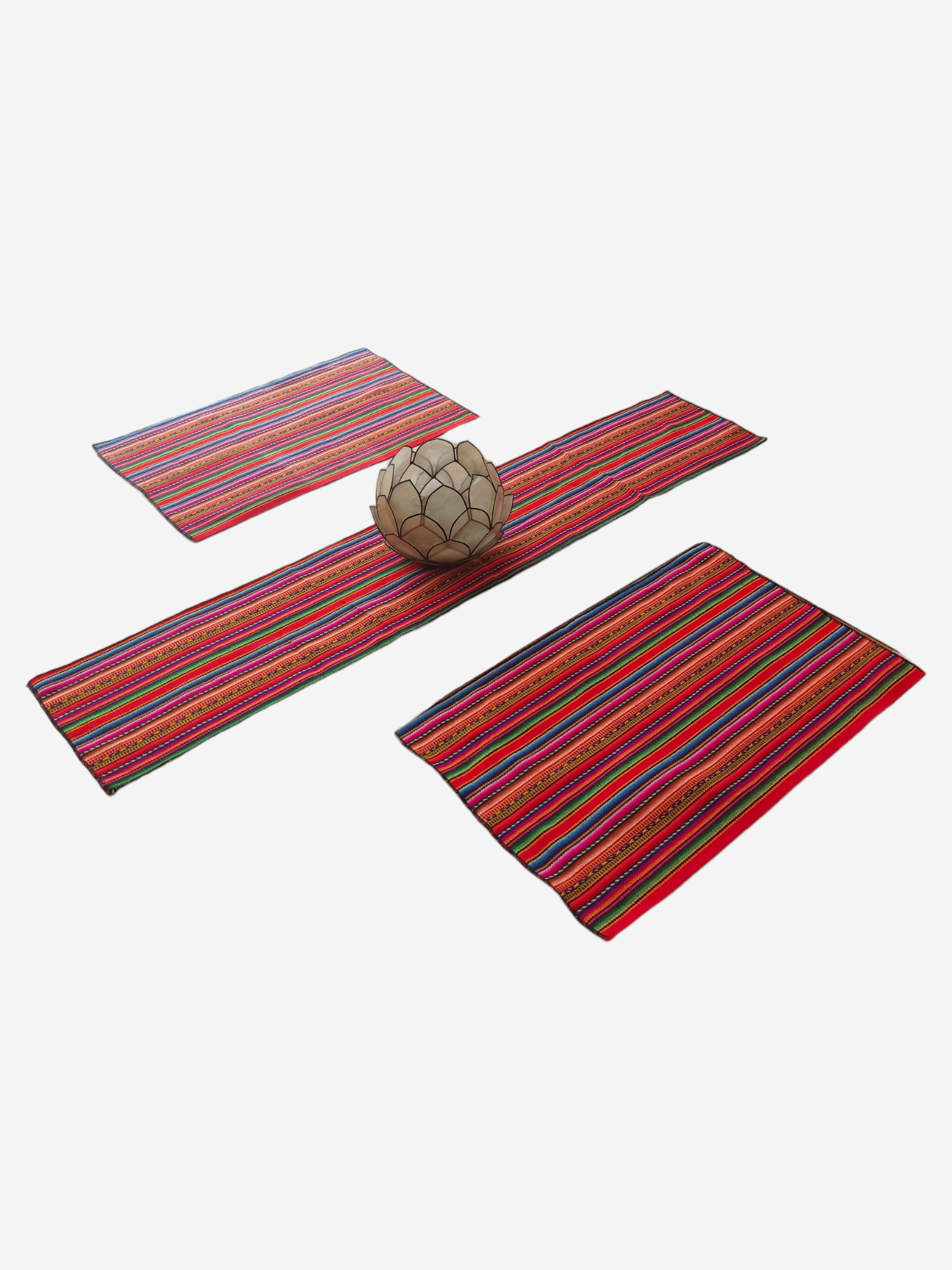 Set de 1 camino y 2 individuales para mesa de manta tejida, le brindan calidez y color al espacio donde se lo coloque.