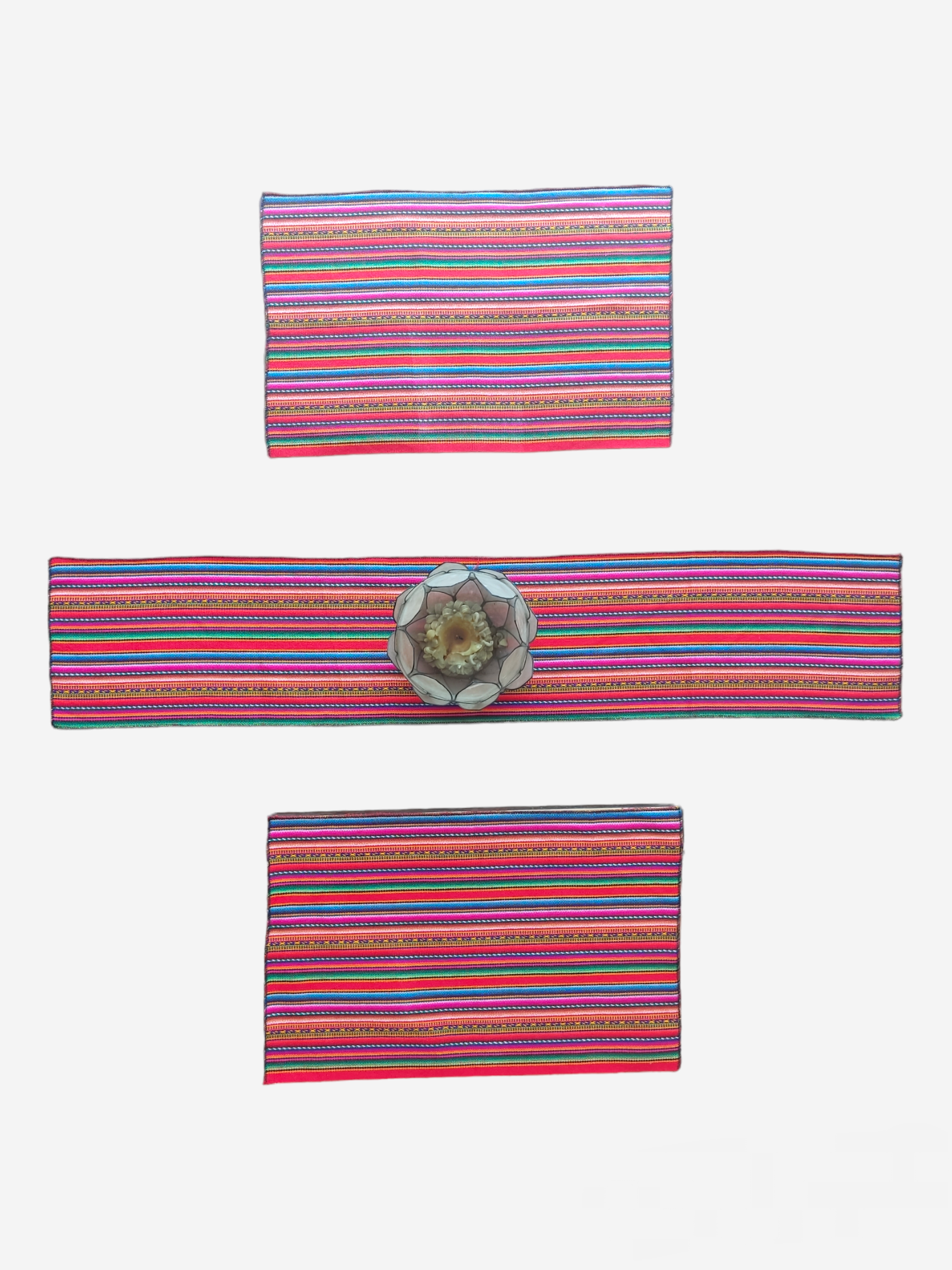 Set de 1 camino y 6 individuales para mesa de manta tejida, le brindan calidez y color al espacio donde se lo coloque.