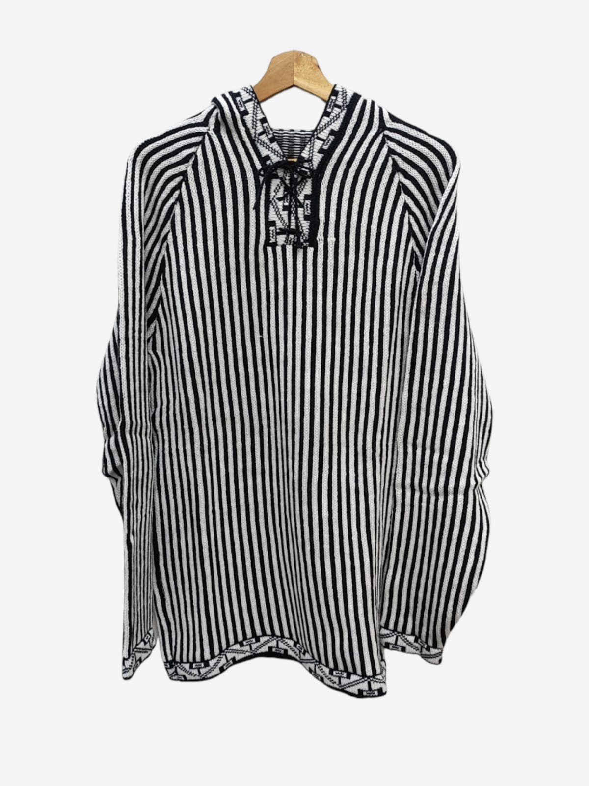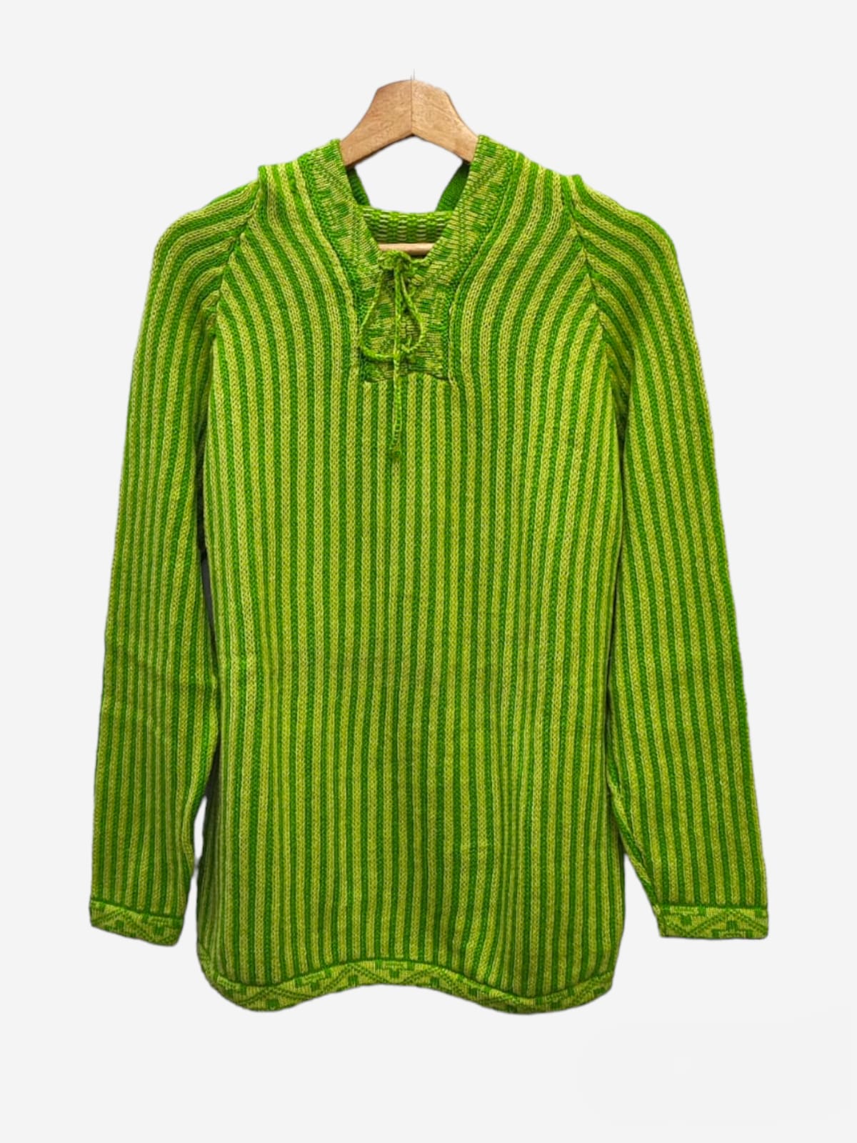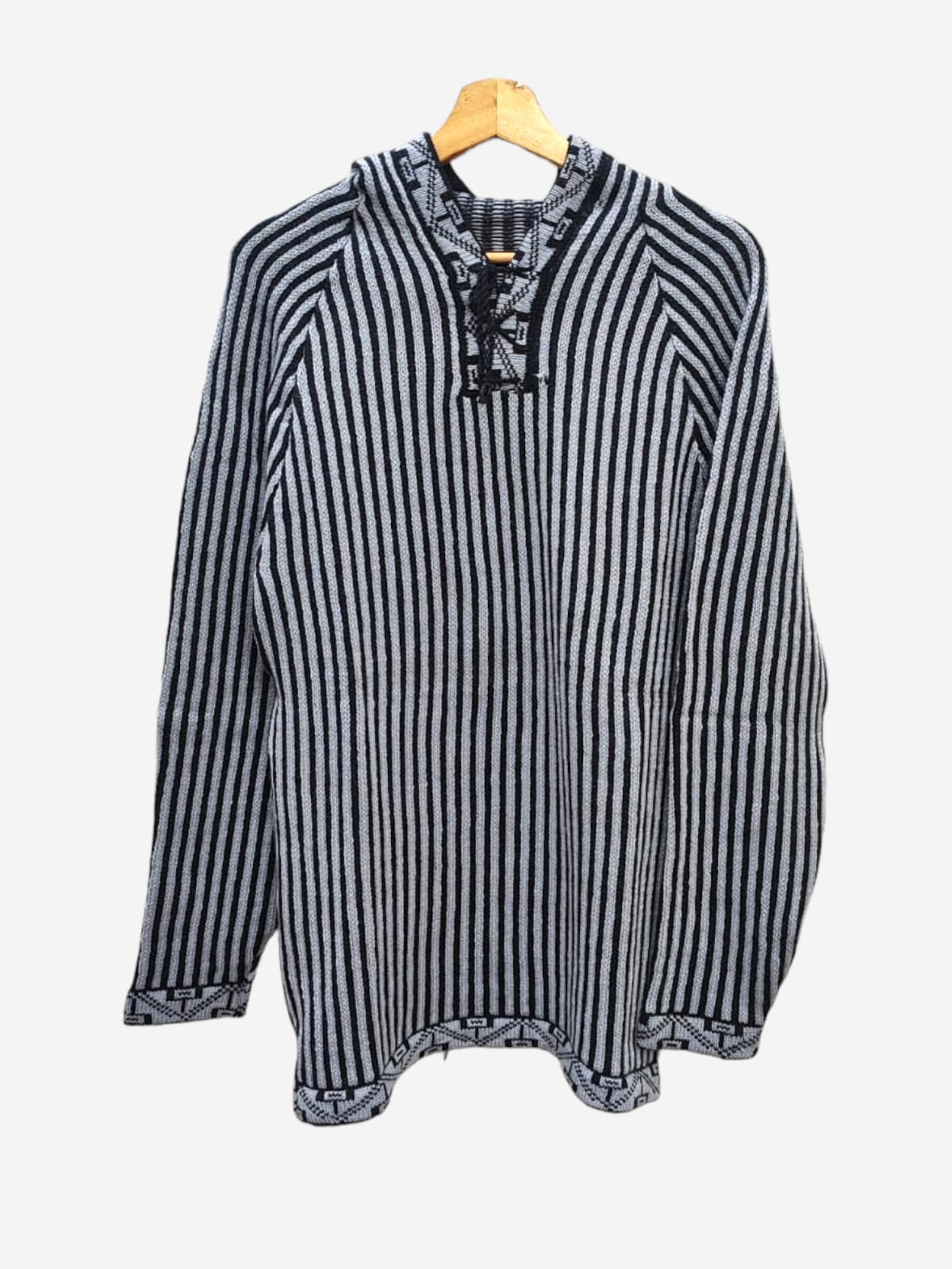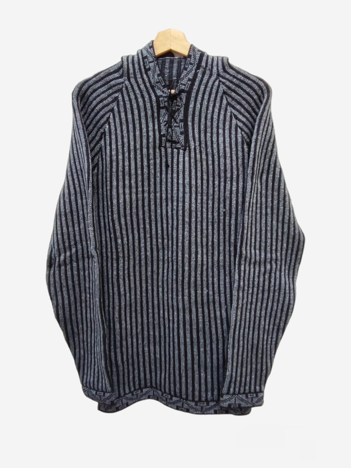 Chompa Hatun en este caso un diseño a rayas, cuenta con capucha y el cuello en V ajustable. son unisex.